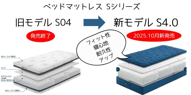 従来のベッドマットレスSシリーズ(S01、S02、S03、S04、S04p)に比べて、“寝心地”や”耐久性”がアップしてるんですね。
