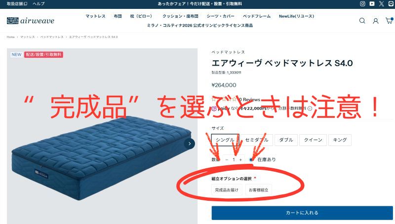 ベッドマットレスの一部の製品は”完成品““お客様組立”が選べるようになってますが、、、