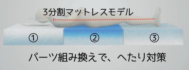 | 寝心地 | 反発力はありつつ、 全体的に優しめ | 肩は優しく、腰は硬め (悩みが出やすい部分に配慮) | 体型や好みに合わせてアレンジ可 |