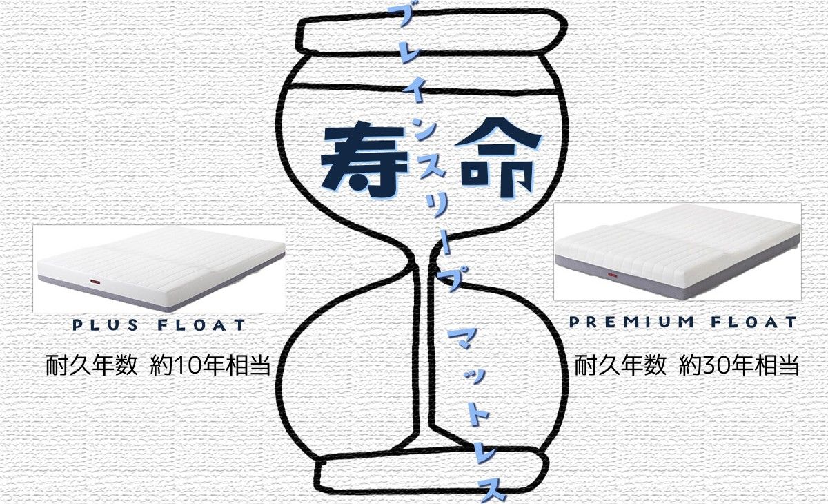 ブレインスリープ マットレスの耐久年数は、公式で「プレミアム=30年相当」、「プラス=10年相当」が目安です。