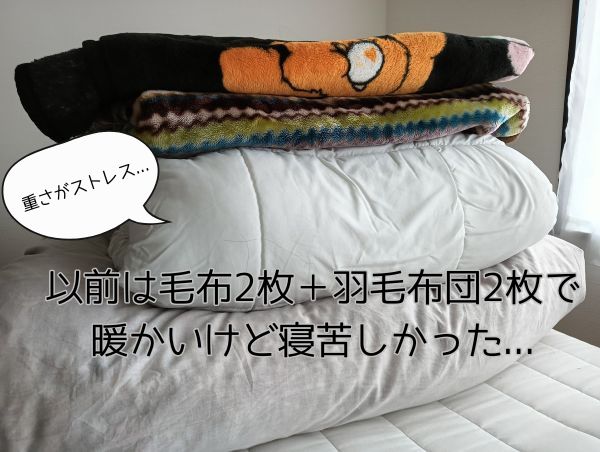 というのも、以前の私は毛布2枚+羽毛2枚を重ねて冬を越してたんですよね…。