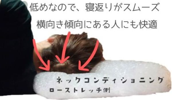ローストレッチ側は自然な寝心地なので、首への負荷がかからず楽に眠れます。